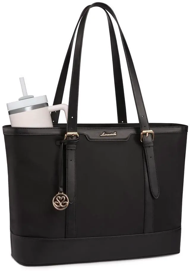 LOVEVOOK Laptop Tote Bag for Women 17.3 Inch Computer Work Bags with Cup Holder&Metal Accessories, Large Leather Teacher Bag Purses for Briefcase Business Office Travel Black