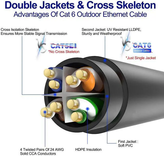 Our Advantages: Feature Double Jackets. Super Sturdy and Durable.The Second UV Resistant LLDPE jacket is ideal for outdoor and direct buried installation. It can withstand temperature changes, sunlight, soil, water, snow, potential wildlife and other outdoor factors. Buried directly underground or used in conduits----The joints feature a SR (stress relief) anti-break design----Especially, It can support POE Camera perfectly.