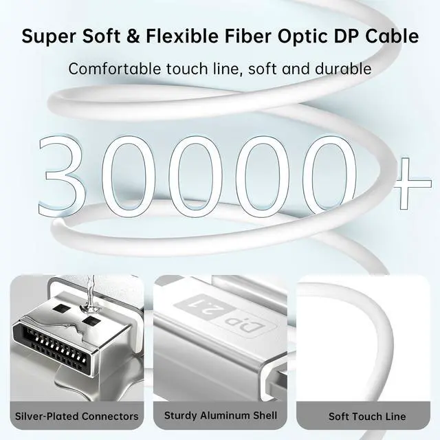 8K Fiber Optic DisplayPort Cable 2.1Displayport 2.1 cable supports high resolution 16K@30Hz, 8K@60Hz, 4K@240Hz/120Hz/144Hz. DP 2.1 cable provides 40Gbps bandwidth, ensuring high-quality content transmission and lossless audio output, giving you the ultimate gaming and movie experience.