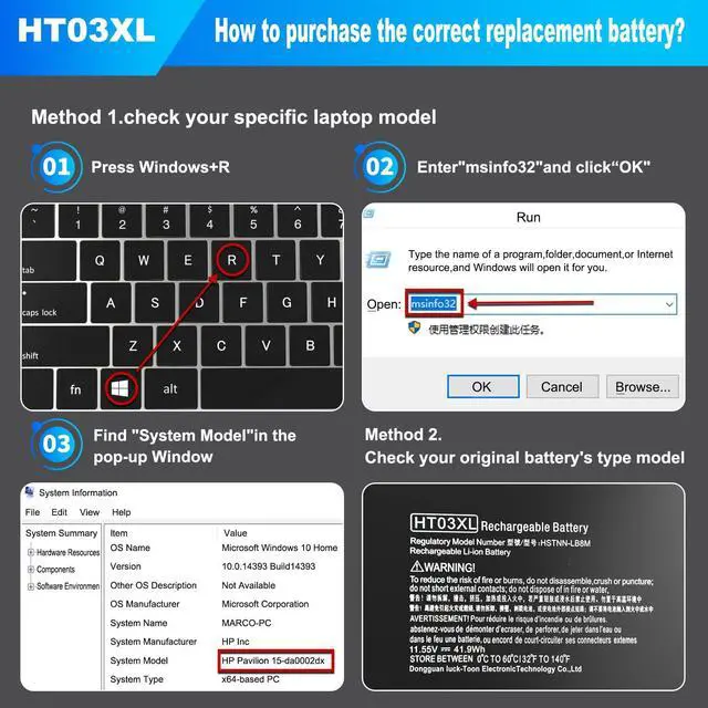 Product DetailsHT03XL new HTO3XL battery for Hp Pavilion computers, Battery Type: Li-Ion, Capacity: 41.9Wh 3630mah, Voltage: 11.55v, Cells: 3-Cell. Up to 600 recharge cycles over the life of the L11119-855 battery, Package Includes: 1 × HT03XL Battery, 1 × screwdriver, 1 × Installation Manual