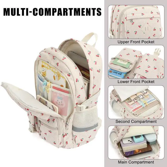 Dimensions12"L x 6.7"W x 17.7"H. The corduroy backpack features multiple pockets, including 1 main compartment, 1 middle pocket, 3 front pockets, and 2 side pockets, providing organized storage for textbooks, binders, a 15.6-inch laptop, stationery, and other personal essentials.