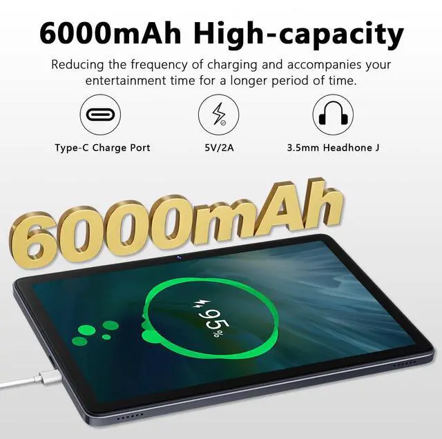 New 6000mAh Battery The tablet is equipped with a 6000mAh long-lasting battery, which makes reading, browsing the web, watching videos and listening to music easy. It is suitable for both daily life and traveling. It is also a great companion for your entertainment and a perfect gift for all