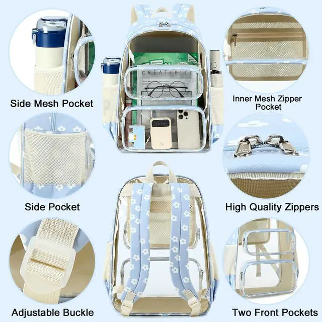 Large capacity & 6 pocketsclear book bag measurement: 17"(H)*12.5"(L)*6(W),Well made with quality zippers.clear back pack with 1 large double zipper main compartment, It's big enough for many binders, books and 15.6" laptop; 2 front zipper pocket to store color pencil, tape,glue stick,keys, etc; 2 side pockets:1 stretchable mesh pocket for water bottle or umbrella , and another zipper pocket for personal items.