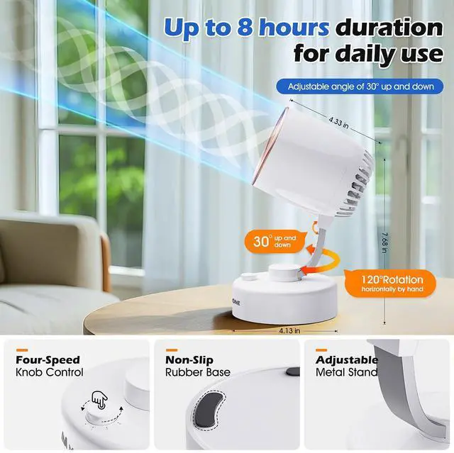 4000mAh Battery: This is a 4000 mAh battery powered rechargeable table fan. 4-9hrs runtime with 4-speed adjustment. Charging input 5V/2A. The package includes a dedicated USB-C charging cable with universal compatibility-seamlessly connect to wall chargers, car outlets, or laptops. After fully charged, you can enjoy up to 9 hours of cordless cooling. What's more, it's battery operated but you can also use it while charging.