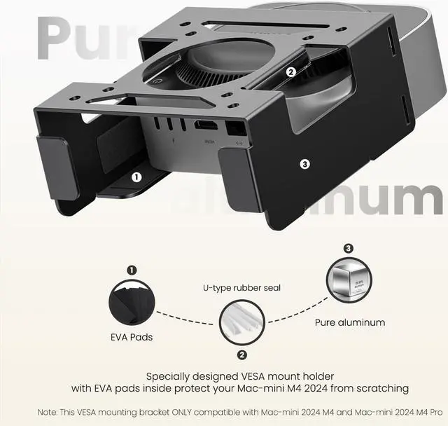 The VESA mounted holder is constructed from pure aluminum metal with EVA foam padding inside to prevent scratches and abrasion resistance, providing enhanced protection. Monitor mounted bracket has an anti-theft function because of two alternative anti-theft bars (NOT include lock). Protect your Mac-mini M4 2024 from being stolen or moved around at will!