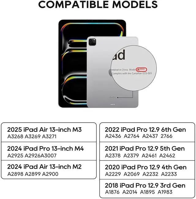 Pekarejue wireless keyboard case is compatible with 2024 Apple iPad Pro 13-inch (M4 2024), iPad Air 13 inch (M3 2025), iPad Air 13 inch (M2 2024) and iPad Pro 12.9 inch 6th 5th 4th 3rd generation. Tablet models included: A3268 A3269 A3271 A2925 A2926 A3007 A2898 A2899 A2900 A2436 A2764 A2437 A2766 A2378 A2461 A2379 A2462 A2233 A2229 A2069 A2232 A1876 A2014 A1895 A1983.