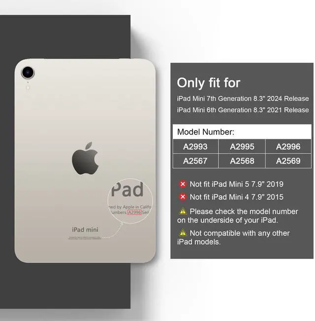 Designed exclusively for iPad mini 7th Generation 2024 (Model: A2995, A2996, A2993, A17 Pro) and iPad mini 6th Generation 2021 (Model: A2567, A2568, A2569), this case offers a precise fit for the 8.3-inch Liquid Retina Display. Please confirm your iPad model on the back of the device before purchase. It is not compatible with any other iPad models