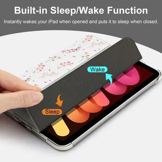 Magnetic protective cover automatically wakes iPad mini 7th/6th Gen when open and hibernates when closed to conserve power. Tri-fold stand provides the perfect viewing and typing angle