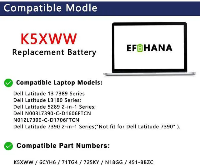EFOHANA K5XWW Battery Replacement for Dell Latitude 7389 Latitude 7390 Latitude 12 5000 5289 2-in-1 L3180 E5289 P29S001 P29S002 Series Laptop 451-BBZC 6CYH6 71TG4 725KY N18GG CFX97 7.6V 60Wh 4 Cell