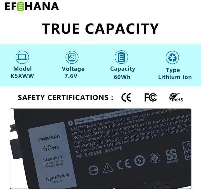 [Specifications] Model: K5XWW // Battery type: Li-ion // Voltage: 7.6V // Capacity: 60Wh/7500mAh // 100% New from Manufacturer. Top circuit boards and smart chip