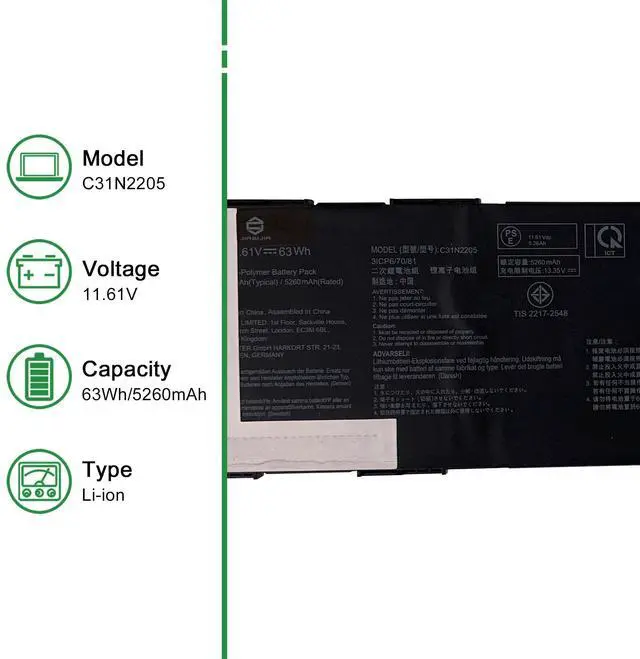 • Model: C31N2205 // Voltage: 11.61V // Capacity: 63Wh 5260mAh // Color: Black // Type: Plug & Play Li-ion Battery.