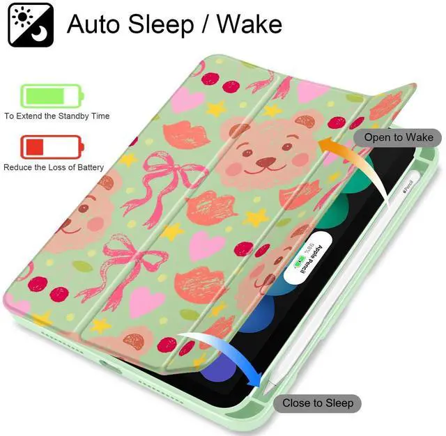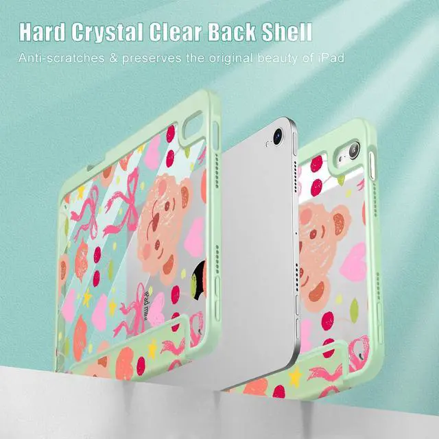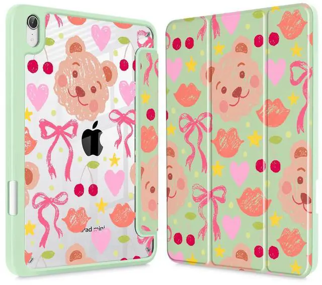 Mektron Printed Case for iPad mini 7 (A17 Pro) 2024/ Mini 6 2021, iPad mini 7th/6th Generation Case, Buit in Pencil Holder with Clear Back Shell + Trifold Stand + Auto Wake/Sleep, Teddy Bow-Green