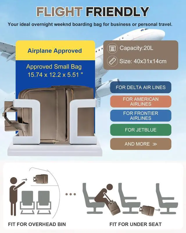 Airline Certified Travel BackpackThe dimension of this travel bag is 40*31*14cm / 15.7*12.2*5.5'' and weighs only 2 lbs. This luggage backpack meets the maximum size requirements for most IATA flights, and its compact design can be placed directly under overhead luggage racks and seats to help you save extra money. Plus, it opens 180° like a suitcase, allowing you to move quickly through airport security.