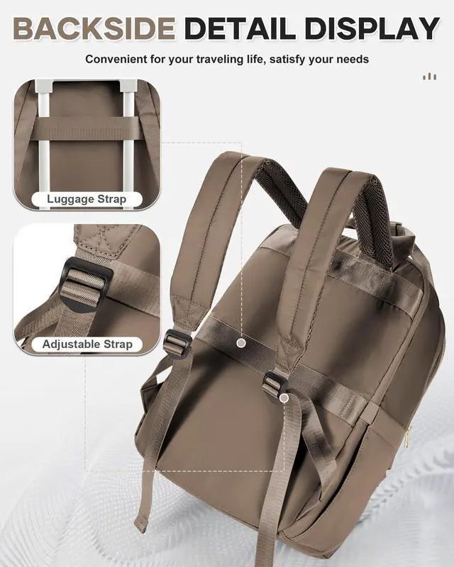 Multi-Pocket Backpack This waterproof backpack has multiple compartments, spacious enough for your 2-3 days traveling needs. One large capacity main pocket can hold about 5-6 pieces of thin tops or pants, suitable for short-term trips. The front of the backpack has multiple multifunctional pockets, and on the side are two adjustable elasticized side pockets to put down your water bottle and umbrella. A practical computer compartment can easily fit a 15.6'' laptop for your work needs.
