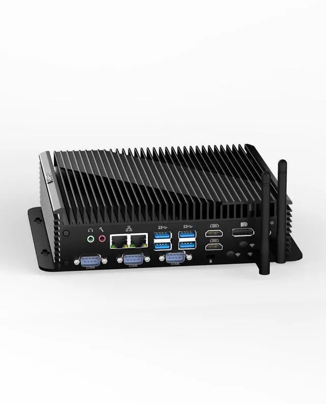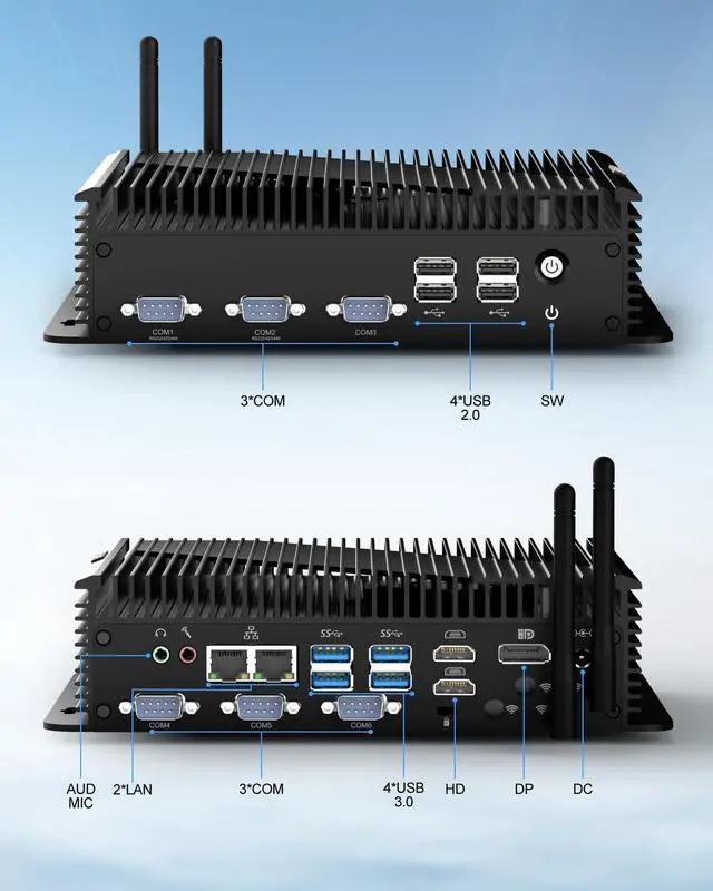 [Multi Interface Design] The industrial PC has multiple interfaces: 1*switch button, 4*USB 2.0, 4*USB 3.0, 1*DC input port, 6*DB 9-pin COM, supports 6-RS232 or 4 RS232+2 RS422/RS485, 2*RJ45 2.5Gbps LAN, 1*Kensington lock hole, 1*Audio output, 1*microphone input. PC industrial i5 is compatible with various display devices such as TVs, monitors, projectors and advertising machines.