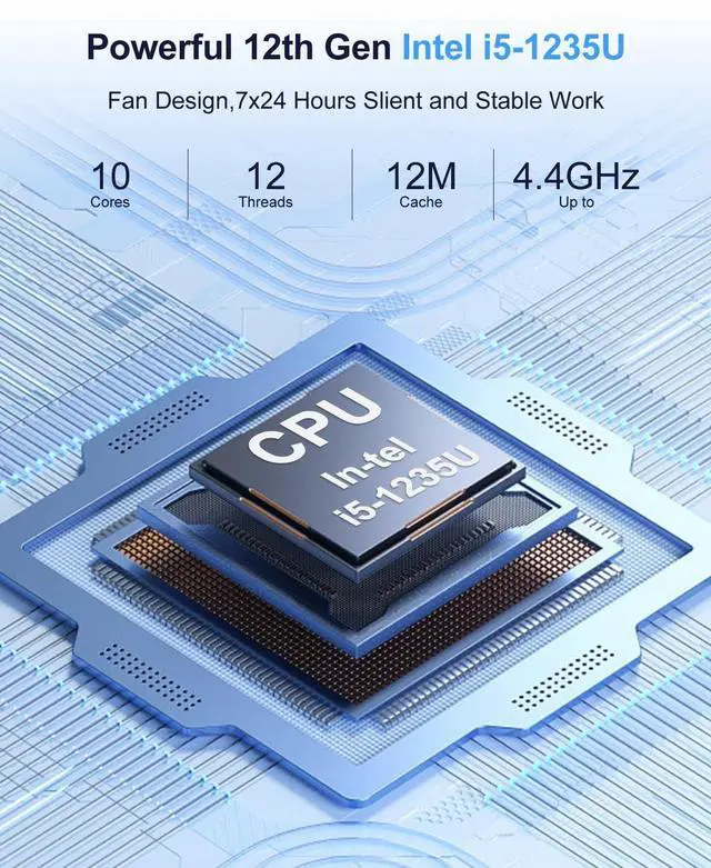[High Performance CPU] The small industrial computer is equipped with a 10-core 12-thread Core i5-1235U processor (up to 4.4GHz) preinstalled with Win 11 Pro, which allows efficient multitasking. This i5 industrial mini pc adopts 7nm lithography technology, 12MB smart cache and low power consumption.