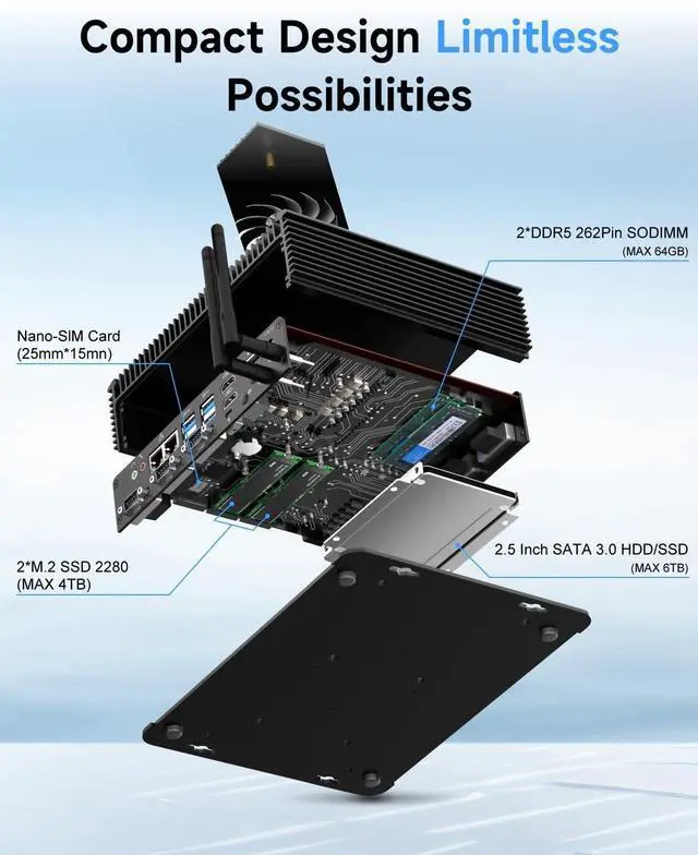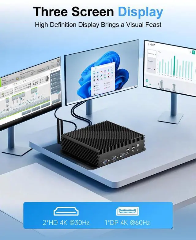 [4K 60Hz Three Screen Display] Industrial mini pc win 11 pro supports three screen displays, two HDMI (1.4) 4K 30Hz, supports audio and video transmission and one DP (1.2) 4K 60Hz, supports audio and video transmission. Industrial control PC can meet various high standards for 4K video transmission