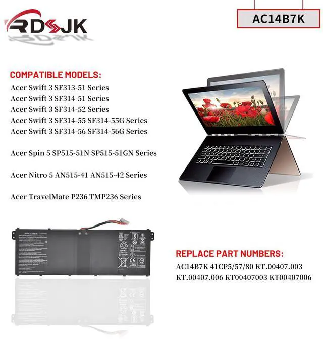 Compatible Models: Fit for Acer Swift 3 SF313-51 SF314-51 SF314-51-36N7 SF314-52 SF314-52G SF314-52-536Y SF314-52-584J SF314-55 SF314-55G SF314-56 SF314-56G Spin 5 SP515-51N SP515-51GN-57B1 SP515-51GN-84KQ Nitro 5 AN515-41 AN515-42 TravelMate P236 TMP236 Series
