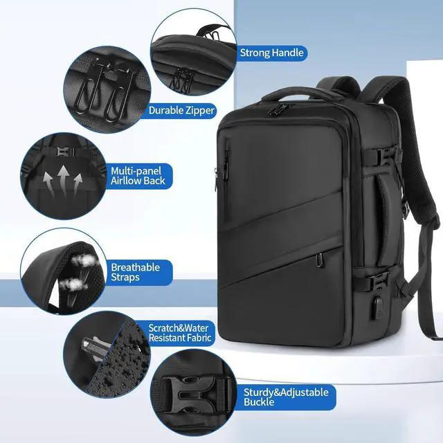 bag ^^ -: The backpack for traveling on airplane has a separate padded compartment for 16" laptop; The main compartment with double zippers has enough storage space for your clothes, camera or daily personal items; The front compartment and two front zipper pockets for different purposes keep your items organized and easier to find ^^: The expandable laptop backpack equipped with adjustable chest straps, comfortable shoulder straps, mesh ventilated back panel, can efficaciously relieve the pressure on shoulder and neck after longtime carrying. It features comfortable and thickened sponge handles on the top and side to carry by hand. It also features a luggage belt on the back, designed for attaching to your suitcase ^^