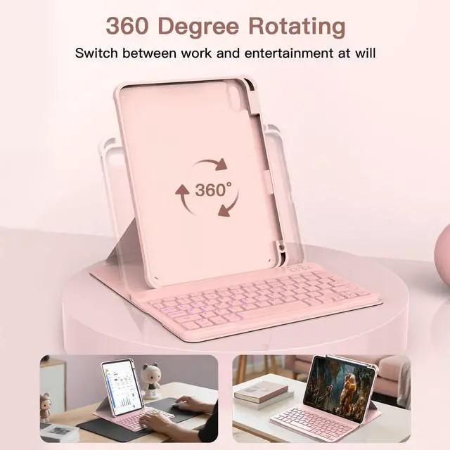 RAYMCRAFT for iPad 11th(A16, 2025)/10th Generation Case with Keyboard, 360 Rotatable Case & Detachable Backlit Keyboard, Precision Cutouts and Pen Holder for iPad A16 11''/10th 10.9'', Light Pink