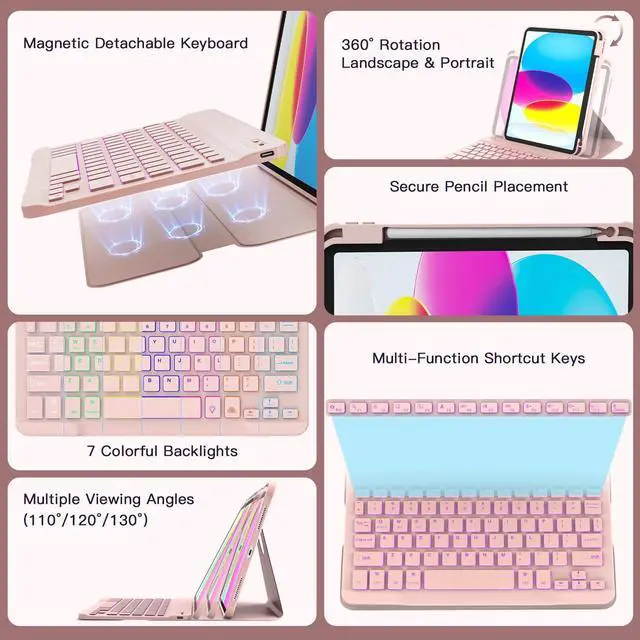 Colors: The magnetic detachable keyboard with 7-color backlight & 3-level brightness adjustment enjoy comfortable typing in any lighting condition. Featuring a row of shortcut keys for instant control, volume and brightness perfect companion for home, office, or travel.
