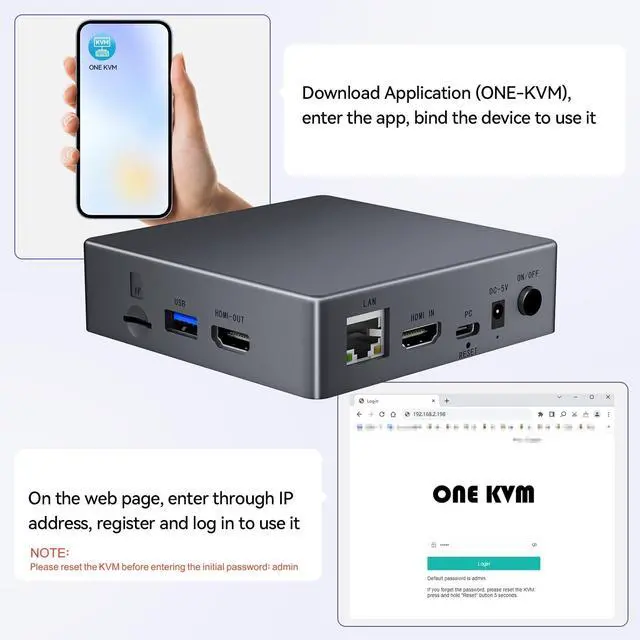 Remote control IP KVMWhether you are at home or on a trip, you can use a personal computer or mobile phone to remotely access your work computer. No additional software or drivers need to be installed on the controlled computer, and KVM over IP is suitable for remote work, IT management, and industrial applications. ^^ Easy Setup & Universal Compatibility Simply connect HDMI and USB cables between the controlled device and the remote KVM, and connect an Ethernet cable to the network KVM. You can remotely control the controlled device via an app or website.