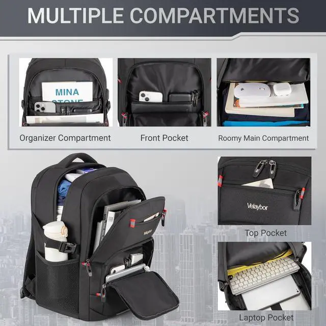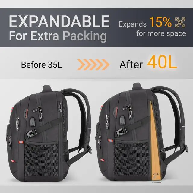 SPACIOUS & ROOMYA dedicated laptop sleeve fits 15.6 -inch laptops, plus 15-inch or smaller MacBooks. The generous main compartment swallows travel accessories, chargers, stationery, and even a change of clothes, while hidden mesh pockets inside keep cords and small gadgets from getting lost. Dual side elastic mesh pockets stretch to hold water bottles and folding umbrellas. Plus, an expandable zipper design expands the main compartment from 35L to 40L (a 15% capacity boost) ^^ COMFORT & Ergonomic DesignAn ergonomic airflow back panel with multi-density foam padding delivers cloud-like cushioning while preventing overheating.