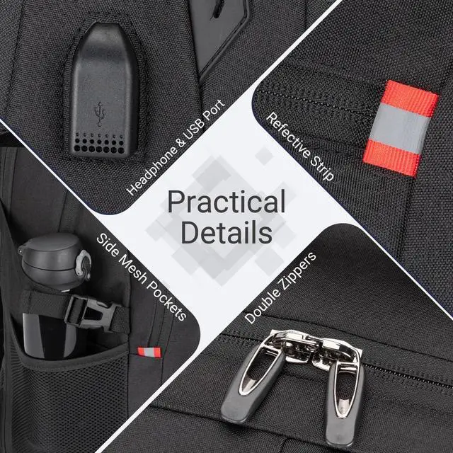 Meanwhile, a discreet audio port on the side threads headphones or a charging cable through effortlessly, keeping cords organized and your devices accessible without digging through the main compartment ^^ ROBUST & DURABLE MATERIALSMade of encrypted water-resistant polyester (20% thicker than standard), with rust-proof metal zippers and double-stitched seams that withstand 60 pounds or more of repeated pulling. Perfect for office, college, commutesa durable gift for any occasion
