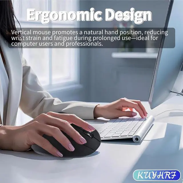 Introducing the **KUYHRF Ergonomic Vertical Wireless Mouse**, designed for comfort and efficiency. This innovative mouse features a unique vertical shape that encourages a natural hand position, reducing muscle strain and helping to prevent wrist injuries like carpal tunnel syndrome. With a dual USB C interface, you can easily connect to PCs, laptops, and Mac systems, making it the perfect computer accessory for any user.