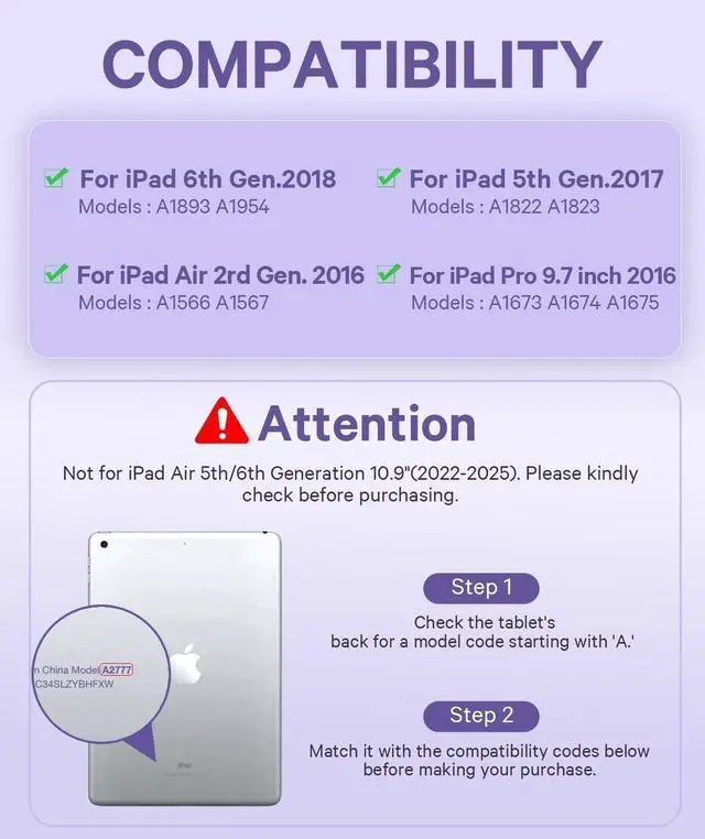 Compatibility: GreenLaw Keyboard for iPad 9.7 is compatible with 2018 iPad 6th generation (A1893/A1954), 2017 iPad 5th generation (A1822/A1823), iPad Pro 9.7 (A1673/A1674/A1675), iPad Air 2 (A1566/A1567). Before you order, please check the back of your iPad to confirm the model number.