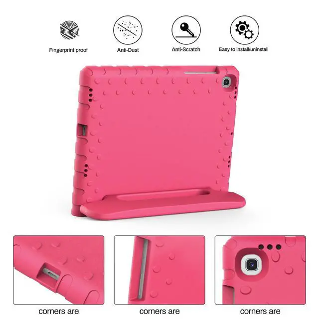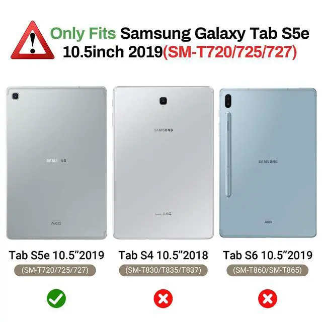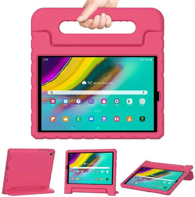 [Compatibility] Protective shock absorption kids case cover specifically designed for Samsung Galaxy Tab S5e 10.5 Inch 2019 Release Model (SM-T720/SM-T725//SM-T727). NOT compatible with other models. ^^ [Kid-friendly Material] Constructed from impact-resistant EVA material, drop protection and impact-resistance safeguarding your device beyond normal wear and tear ^^ [Precise Cut-Outs] All ports and controls (ports, buttons, speakers, etc. ) can be accessed quickly and easily ^^ [Portable Handle Design] The handle can be folded, as a sturdy stand with double angles for convenient viewing, typing, learning and entertainment on the go ^^ [Strong Corner Protection] Lightweight and soft EVA can prevent the tablet from accidental drops, bumps and scratches.