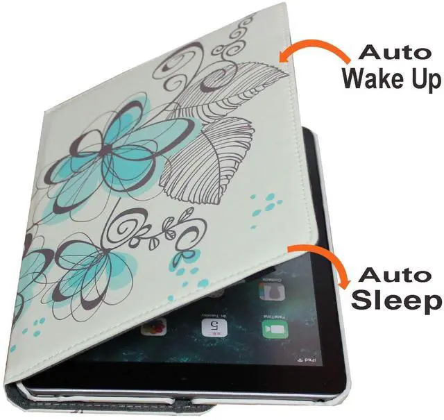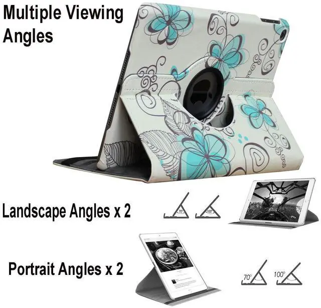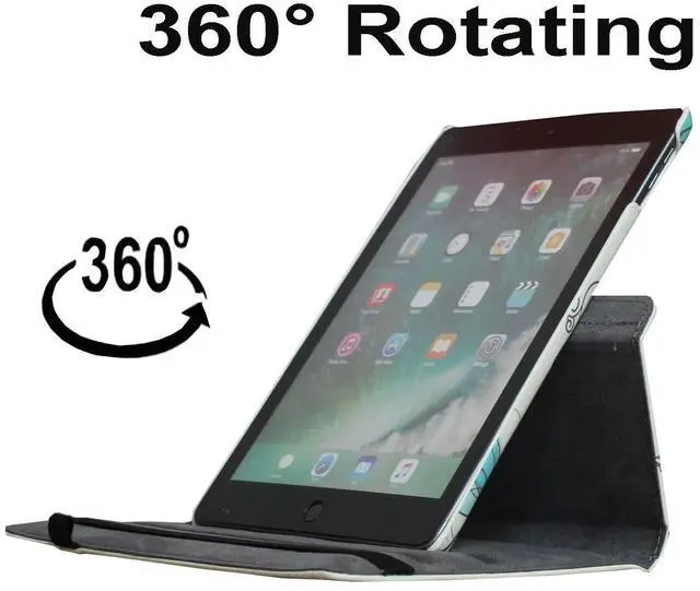 360 RotationRotary Swivel allows 360 degrees rotation to Make it easy to transition between landscape and portrait modes while keeping your tablet in the case. Smart caseAutomatically wake up iPad 5th or 6th generation on open and Sleep on close with magnetic. Premium feelingMade of high quality Polyurethane (PU) leather with soft micro fiber interior lining. Built in StandConvenient Stand Positions for easy typing, reading and viewing. Built with Pen HolderConveniently secure sylus or pencil. Special DesignBuilt in cut out and holes for Full accesses to all features and ports. Fit Models and