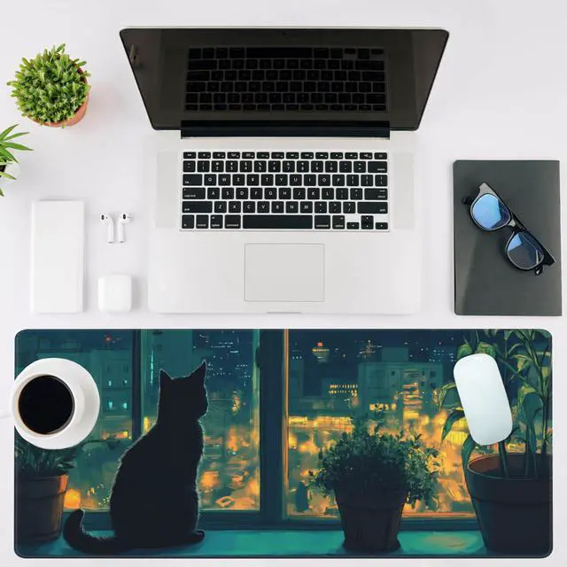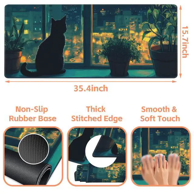 NIYLYNSYN Mouse Pad Large Cat Sitting on The Windowsill Non-Slip Game Desk Mat with Stitched Edge Laptop Keyboard Desk Pad for Work Home Gaming (35.4 x 15.7 Inches)