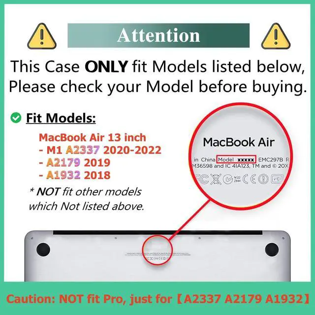 Fit Model Numbers: A2337 M1 & A2179 & A1932. Release 2020 2021 -- MGN63LL/A, MGND3LL/A, MGN93LL/A, MGN73LL/A, MGNE3LL/A, MGNA3LL/A, MWTJ2LL/A, MVH22LL/A, MWTL2LL/A, MWTK2LL/A, MVH52LL/A, MVH42LL/A. Release 2019 2018 -- MVFH2LL/A, MVFM2LL/A, MVFK2LL/A, MVFJ2LL/A, MVFN2LL/A, MVFL2LL/A, MRE82LL/A, MREE2LL/A, MREA2LL/A, MRE92LL/A, MREF2LL/A, MREC2LL/A. The model number is located on the back of your device, in small prints which says ''Model: Axxxx''. BEFORE PURCHASING, please make sure your laptop's model number is one of these model numbers (A2337/ A2179/ A1932). Product Features Plastic Hard Shell Case can effectively protect your 13 inch laptop from scrapes, scratches and other damage. Laptop Protective Case have two rows of bottom ventilation, allowing safe heat disbursement, help device staying cool. Designed with four anti-slip silicone pads on backside which can keep your laptop firmly in place, more stable in use. Coming with a keyboard cover to protect your keyboard against the accumulation of dust, liquid splashes and keys wear. With precise cutouts full access to all controls and features, plug your charger, cable or headset without removing the case. Slim Hard Shell Cover Case almost adds no weight to your device, easy to put into your bag, portable to carry around. Available in various of pattern and color for your choice, ideal gift for your family, friends, kids, classmates and etc. Package Included1 * Mac Case for A2337/ A2179/ A19321 *