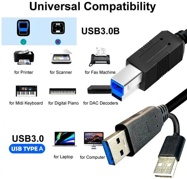 FASTER TRANSMISSION SPEED: USB 3.0 uses less power, but has increased power output up to 4.8 Gbit/s. Compared with the USB 2.0 transmission speed, USB 3.0 is 10 times fasterPlug and play, quick and easy, perfect fit; no need to install any plug-insUSB 3.0 Adapter CableConveniently connect compatible devices with this multi-shielded USB 3.0 A-Male to B-Male cable. Wide CompatibilityUSB 3.0 Type A to Type B Cable Compatible with Printer, USB 3.0 Monitor, USB 3.0 Hub, External Hard Drive, Fujitsu ScanSnap iX500 scanner, Dell S2340T monitor, Dell USB 3.0 docking station, HP USB 3.0 port replicator and More Devices with USB 3.0 Type-B Port.