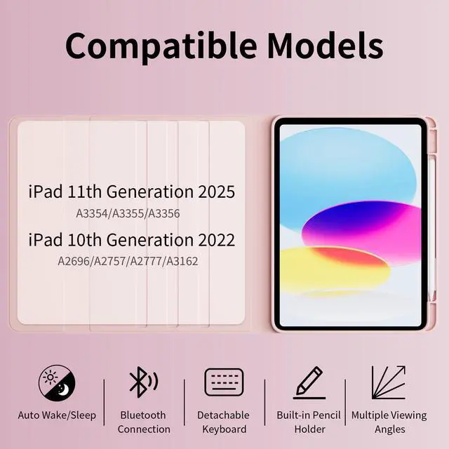 Compatible ModelsThis ipad Keyboard case is designed for ipad (A16) 11th Generation 11 inch 2025 (Model: A3354/A3355/A3356), iPad 10th Generation 10.9 inch 2022 (Model: A2696/A2757/A2777/A3162). NOT compatible with any other devices. To ensure that you have purchased the correct case, please verify the model number "AXXX" in small print on the back bottom of your device