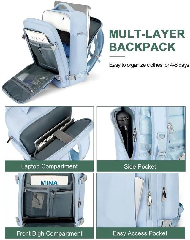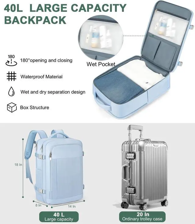 Roomy Capacity & Multi-Pocket: The 40 L Travel Backpack has 1 large main compartments and multiple pockets offer efficient organization and quick access. Separate compartment for a 17.3'' laptop for work and college essentials. A hidden anti-theft pocket at the back secures essential items such as wallet, passport, and ID card. The suitcase backpack also has a side bottle pocket to keep your water cold/warm and a wet and dry compartment for dirty clothes.
