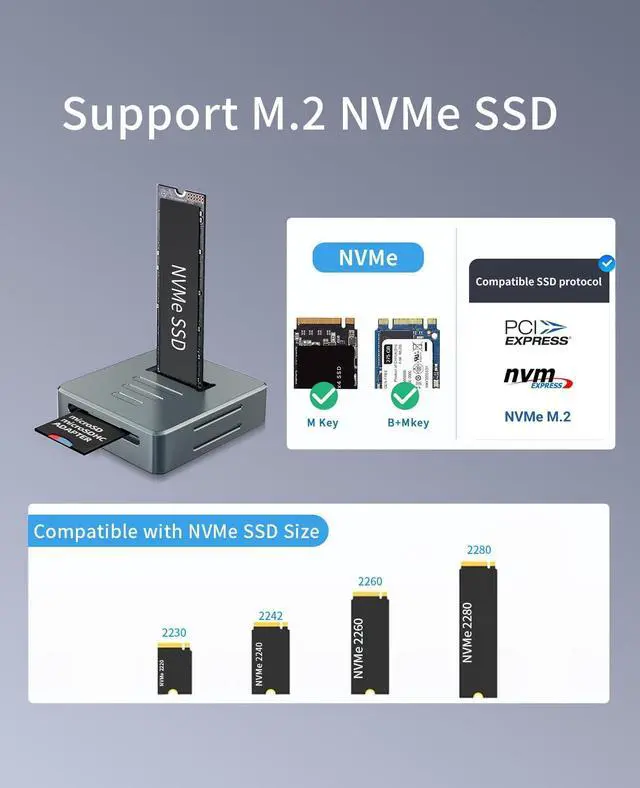 Use: The M. 2 NVMe Reader features a tool-less design that simply plugs in and is ready to use, making it easy to swap out NVMe SSDs, making it a plug-and-play device. This compact NVMe docking station provides a simple solution to create your own external storage for your mobile lifestyle ^^