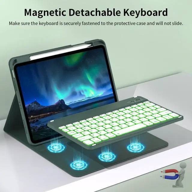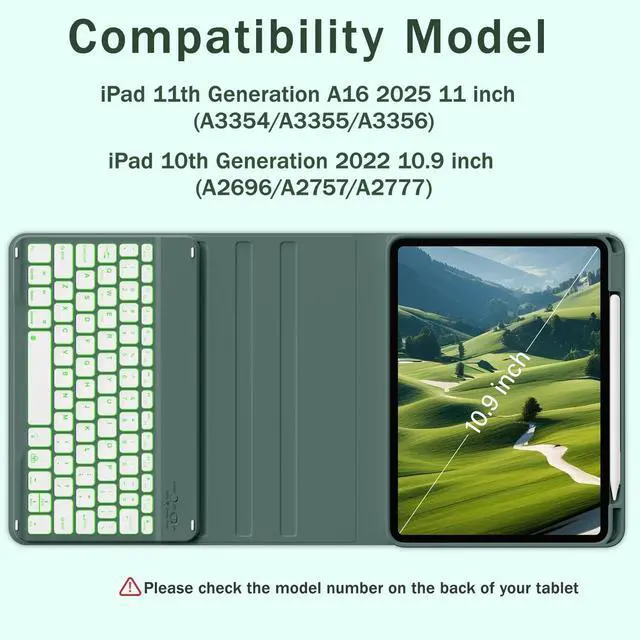 Note: It is not compatible with any other iPad model. Please check the model number on the back of your iPad that begins with A before purchasing ^^ 7-Color Backlight KeyboardDesigned with laser-etched backlit keys, this iPad (A16) keyboard case emits 7 LED backlight colors and 3 brightness options in the dark. You can freely choose your favorite light hue and brightness according to your mood and preference, making light typing easier and more fun, bringing you unprecedented visual enjoyment and creative inspiration ^^ Rechargeable Long-lasting Battery & Multi-Angle SupportThis iPad case with keyboard has a built-in high-capacity battery for greater energy efficiency. It can be fully charged in 2 hours using the Type-C charging cable, ensuring up to 230 hours of working time, making it ideal for study, business and daily use. The case is flexible and convenient with three card slots that can be placed at different tilt angles to adjust the optimal viewing angle ^^ Magnetically Detachable Keyboard & Auto Sleep/WakeThis iPad 10.9 inch case with keyboard is equipped with strong magnets to easily adjust the keyboard position or remove it. Equipped with practical shortcuts and compatible with IOS, Windows and Android systems, it easily meets your daily needs.