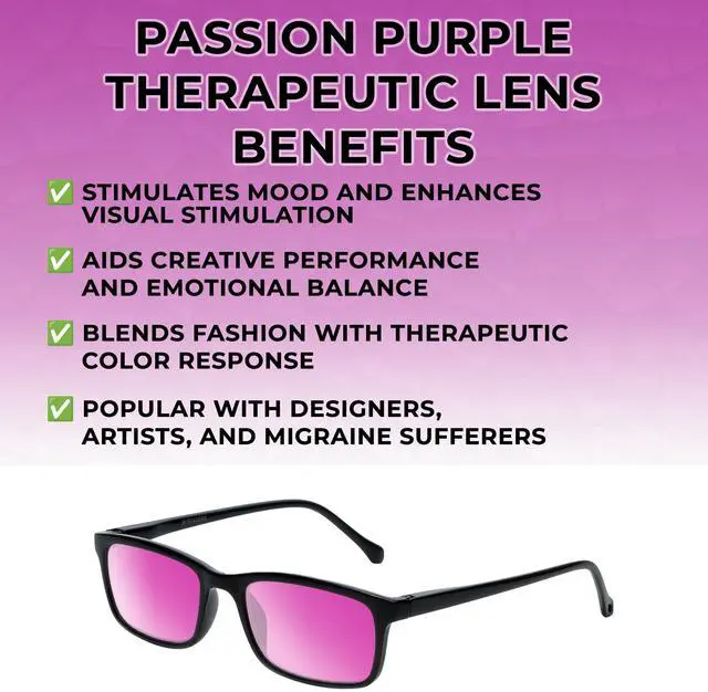 Passion Purple Lenses: Boost creativity & mood with purple tones, designed for stress relief & glare reduction. Ideal for brainstorming & artistic activities.
