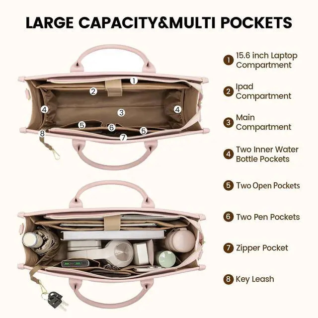 Effortless Organization & Ample Space: This stylish laptop bag for women (Dimensions: 16"L x 12"H x 5.6"W ) is designed to cater to your organizational needs. Laptop purse boasts well-padded compartments perfectly suited for A4 documents, folders, a 15.6" laptop, and a 13-inch tablet, ensuring their safety during transport. With specialized pockets for water bottles and umbrellas, along with a convenient keychain holder, everything has its dedicated place. ^^