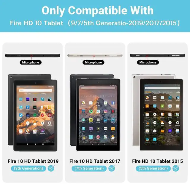 COMPATIBLITY: ONLY fit for Fire 5th/7th/9th Generation Tablet (2015/2017/2019 Release). DOSE NOT compatible with any other model device. Please check the tablet model before you purchase ^^