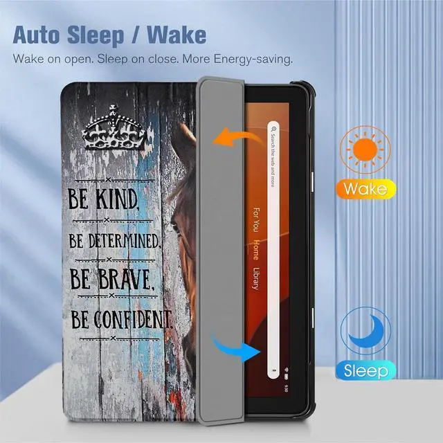 PLEASE NOTE: This case is designed for Kindle Fire 7 Tablet (12th Generation, 2022 Release). Protect your new Kindle with this Case at all times! The Case sports a simple and classy design. The back shell is made from durable polycarbonate material so you do not need to worry about any damages. It offers an easy clip-on application. Because the cover is uniquely designed to flip back and transform the case into a comfortable viewing stand that offers two different viewing angles, this capability allows the viewer to use the new Kindle hands-free whatever your position may be without strain whether it is being used for viewing or for a keypad. All features of Kindle are accessible even with the case on. It even includes a camera hole so you can take pictures and videos without removing it. Watch movies and listen to music clearly with speaker holes! Inspirational Quotes BE KING BE BRAVE BE DETERMINED BE CONFIDENT