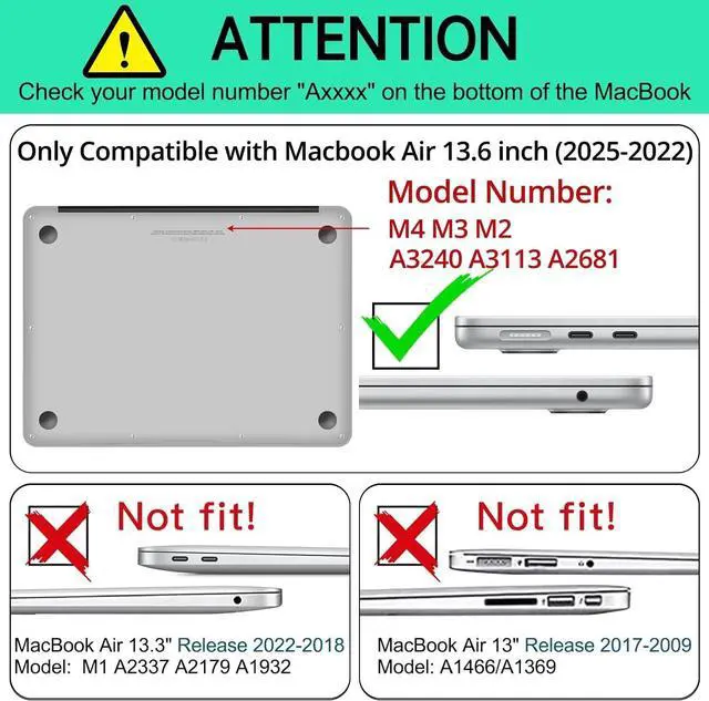 Design for MacBook Air 13.6 inchOnly compatible with MacBook Air 13.6 inch 2025 2024 2023 2022 released with Liquid Retina Display & Touch ID, Model M2 A2681 M3 A3113 M4 A3240 ^^ Fine Cutting CasePrecise cutouts make fully access to all ports, silky use for you without affecting any folding or opening functions. Fit Snug and wont fall out easily ^^ Multi-layer Structure DesignThe MacBook Air 13.6 inch has different protective structure. Smooth back cover give you the comfortable touch feelings without leaving fingerprints ^^ Ultra-thin&Skin-friendly Adopt ultra thin cover and back to keep the original shape.