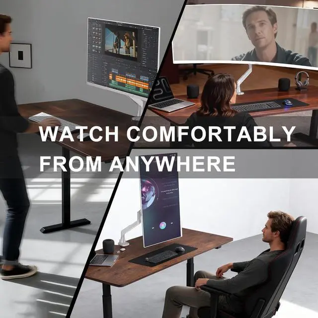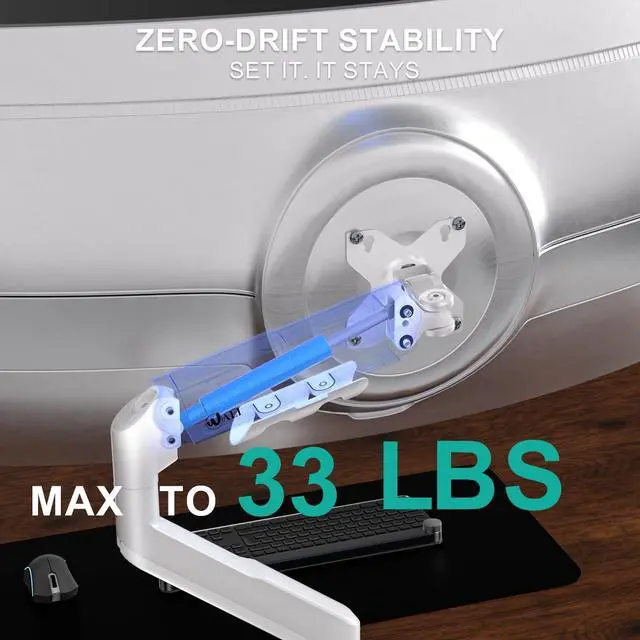 THE ONE-STOP SOLUTION FOR YOUR DESKStop worrying about compatibility or complicated setups. This single monitor arm with desk mount supports 1749 inch flat, curved, and ultrawide monitors with a max load of 33 lbsdesigned as your final upgrade for gaming and home office use ^^ ZERO-DRIFT STABILITY FOR UNINTERRUPTED FOCUSTired of your monitor sagging? The gas spring in this monitor arm delivers Zero-Drift stability. Set your screen once and it stays in positionno drooping, no constant readjustments during long work or gaming sessions ^^ RECLAIM YOUR WORKSPACE FOR PEAK PRODUCTIVITYReplace your monitors clunky base and free up over 80% of desk space.