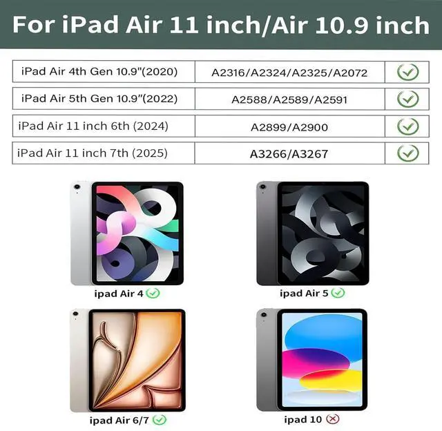 Compatibility]: The keyboard case is compatible with iPad Air 11-inch (M3/M2) 2025/2024 (A3266 / A3267/ A3270/ A2902 / A2903/ A2904), for iPad Air 5th/4th Generation 2022/2020 10.9 inch (A2589/ A2591/ A2588/ A2072/ A2316 / A2324 / A2325). It is not compatible with any other models. Please check the model number starting with "A" on the back of your iPad before purchasing. ^^ [Slim