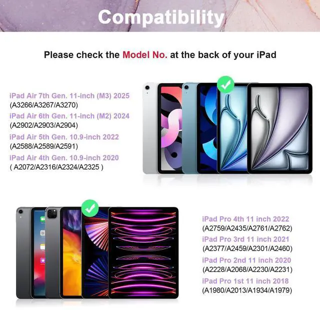 Compatibility: The keyboard case is compatible with iPad Air (M3) 11-inch 2025 (A3266/A3267/A3270), iPad Air 6th 11-inch (M2) 2024(A2902/A2903/A2904), iPad Air 5th 2022(A2588/A2589/A2591), iPad Air 4th 2020A2072/A2316/A2324/A2325), iPad Pro 11-inch 2022 (A2759/A2435/A2761/A2762), iPad Pro 11" 2021(A2377/A2459/A2301/A2460), iPad Pro 11" 2020 (A2228/A2068/A2230/A2231), iPad Pro 11" 2018 (A1980/A2013/A1934/A1979).