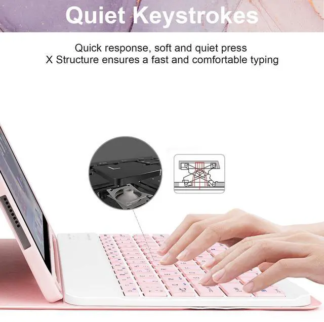 ^^ Detachable & Adjustable: Designed to stand your iPad hands free so you can focus on work, reading, watching videos, typing like on normal computer laptop. Innovative magnetically detachable wireless keyboard design makes it easy to use (the connection range is up to 10 M). And iPad protective case can be adjusted to different angles according to your needs, provides more comfortable feeling of use.