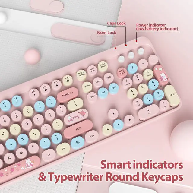 Pink Wireless Keyboard and Mouse Combo The cute color & round keys make your desk look so much fun add vitality to your Desktop; Works with your PC, desktop computer, laptop. compatible with Windows 2000 / XP / 7 / 8 / 10/ vista ^^ Easy to Use & Plug and Play- 2.4GH z Wireless Connection35 feet working range, 2-in-1 nano receiver, no need to install other software, no delays or Drop the line, Make your desk surface more neat and tidy, Keyboard or mice can be used separately, just insert a single USB Receiver to use your Wireless Keyboard Mouse Combo ^^ 13 Multimedia Hot KeysThis wireless typewriter keyboard has 13 multimedia hotkeys for one-touch commands to enhance your productivity.