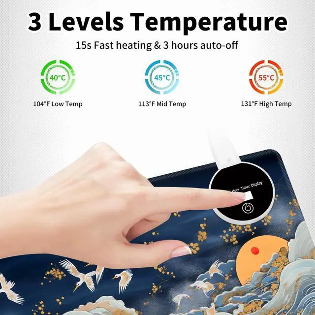 Control Levels: The heated deskmat offers three temperature settings (40C, 45C, and 55C with a 5C range), You can select from 3 different heat levels, with the highest being 55 and the lowest being 40 Press switch for three temperature settings. Heating area is over than 95%. 2.